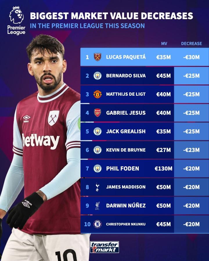 本赛季的英超联赛中,一些球员的身价出现了大幅下滑,德转(CIES Football Observatory)发布了一份英超球员身价下跌榜,让人不禁为他们的市场表现捏一把汗。帕奎塔是这份榜单中最引人关注的名字,他的身价下跌了整整3000万欧元,现如今的身价只有3500万欧元。